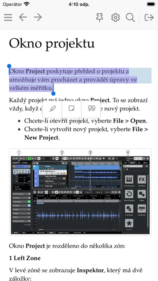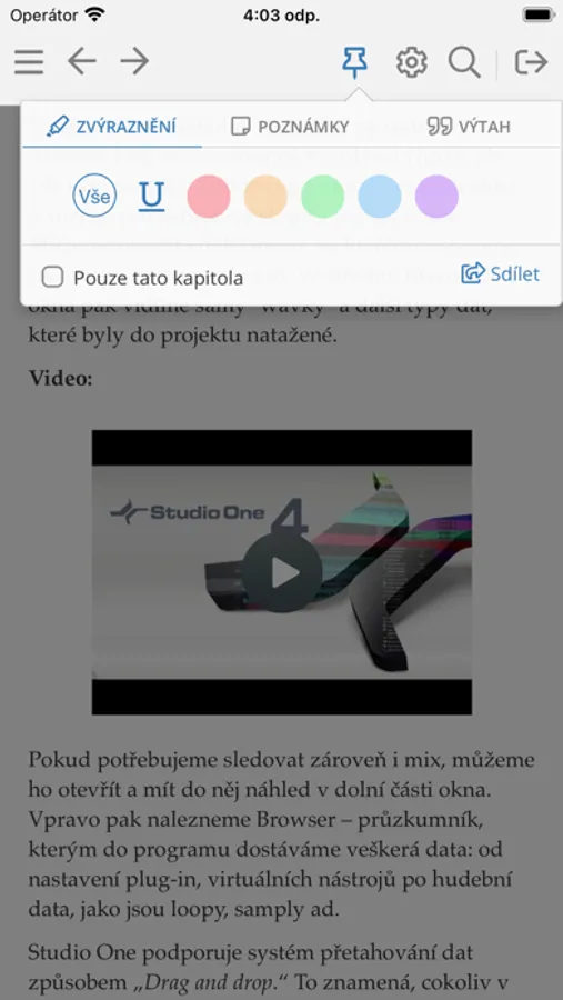 Jednotlivé pasáže knihy dokáži podtrhnout, zvýraznit volitelnou barvou, udělat si poznámky nebo přímo výtah z textu.