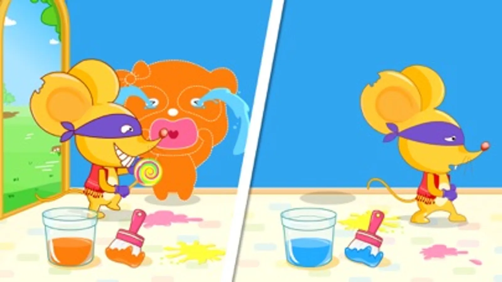 Experiment and color learning and their relationships with MiuMiu to help hide her and her candy from the mischievous mouse! Problem solving and color recognition in this kid’s learning apps!