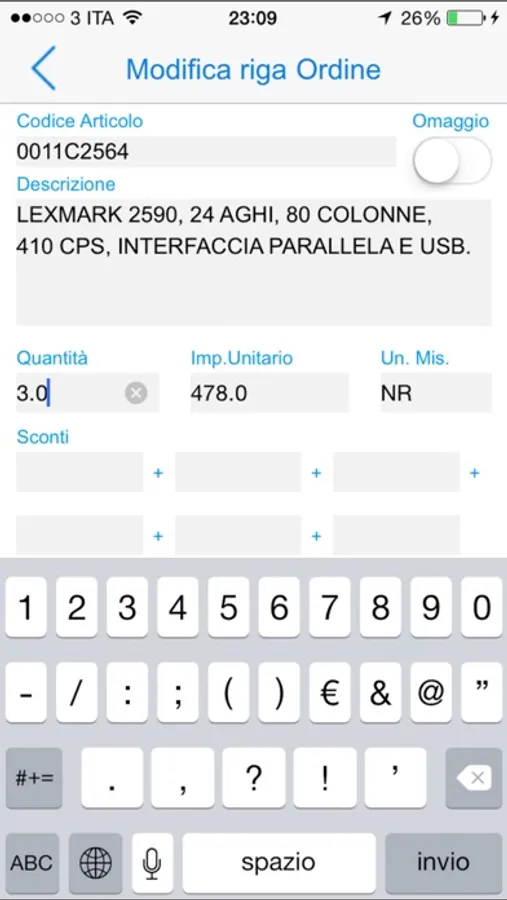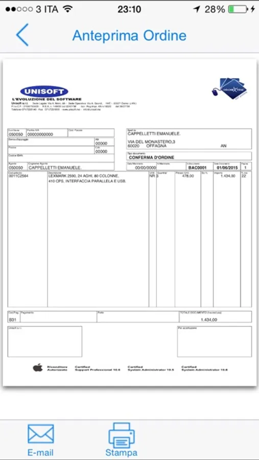 - Inserire gli ordini clienti con possibilità di firma del documento emesso e generazione in formato PDF, (che può essere stampato su dispositivi Air-Print o inviato tramite e-mail direttamente dal dispositivo).