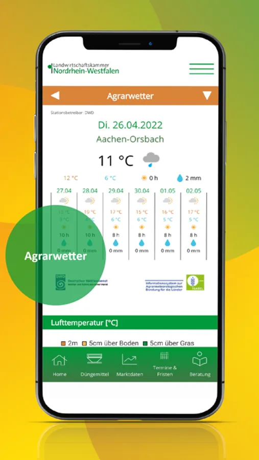 Das Agrar Wetter des DWD unterstützt Sie bei der Düngeplanung und Feldbestellung. Sie erhalten spezifische Wetterlagen zu den Themen Pflanzenbau, Grünland, Raps, Getreide, Zuckerrüben, Mais, Kartoffeln, Obstbau, Forstwirtschaft.