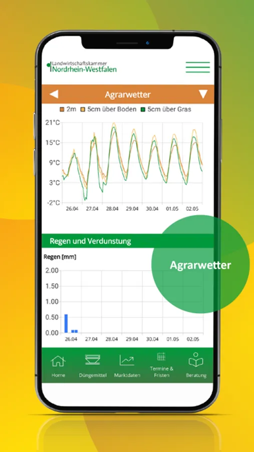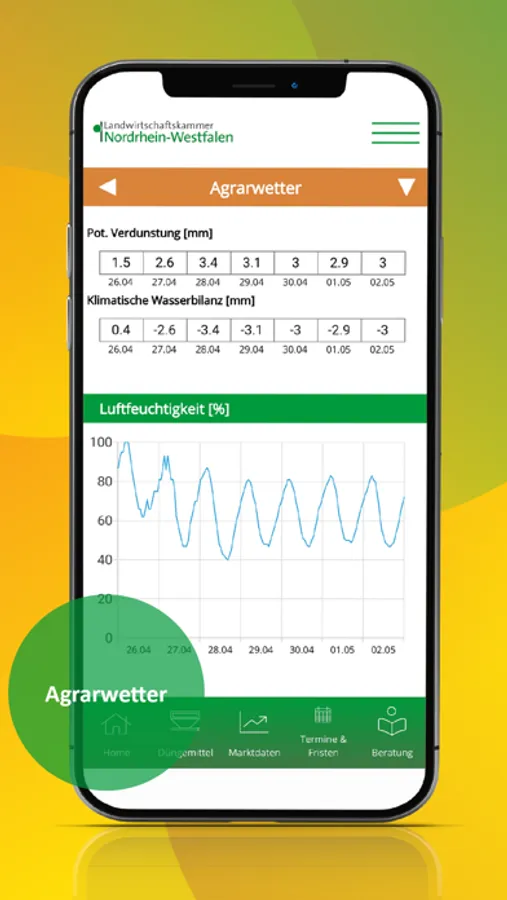 NRW Agrar liefert aktuelle lokale Infos, weist auf wichtige landwirtschaftliche Fristen und Termine hin, empfängt Infodienste, bietet Kontakt zu Beraterinnen und Beratern der Landwirtschaftskammer NRW, zeigt das Agrar Wetter des Deutschen Wetterdienstes, enthält tagesaktuelle Marktpreise und ermöglicht den Zugang zum Düngeportal NRW.