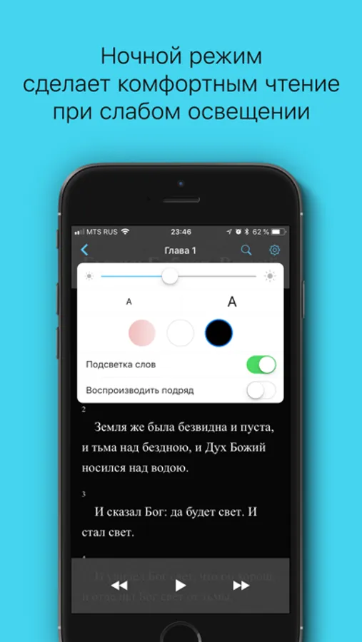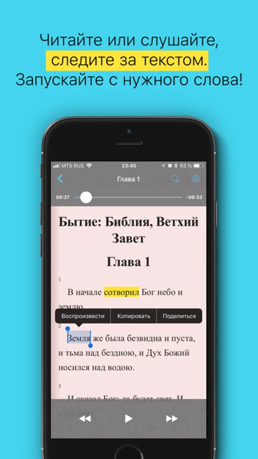 ・Воспроизведение с выбранного слова при помощи долгого касания;