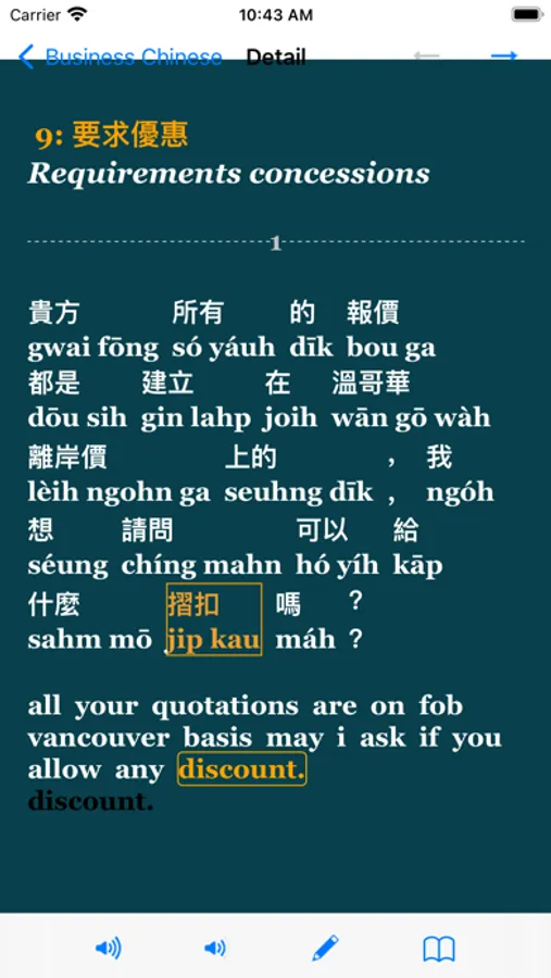 4) Each business sentence has accurate translation between Chinese and English, and the words be associated by their meaning, click English word will highlight the corresponding Chinese word and vice versa. Master business Chinese basic vocabulary becomes so easy.