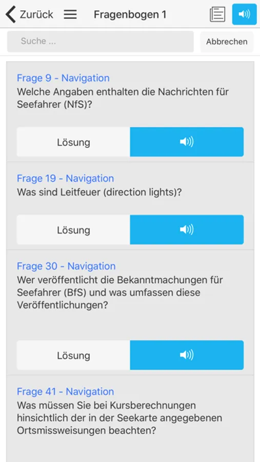 Su soll dir beim Lernen auf die Prüfungen für den Sportbootführerschein Binnen (Motor + Segel), Sportbootführerschein See, Sportküstenschifferschein, die Funkzeugnisse und den Schein für Seenotsignalmittel zur Seite stehen. Die App sind die offiziellen Prüfungsfragen enthalten und auch im Prüfungsbogen-Modus abrufbar, wobei die Bögen im Wortlaut der Fragen und deren Reihenfolge identisch zu denen in der Prüfung sind. Hast du die Frage in Gedanken beantwortet, kannst du deine Lösung überprüfen und vermerken, ob deine Antwort korrekt war. Bei den aktuellen Multiple Choice Fragen geschieht dies automatisch. So ist der aktuelle Lernfortschritt über eine Statistik abrufbar, dies gilt für alle Antworten wie auch für einzelne Fragebögen. Außerdem ist es möglich nur die falschen, richtigen oder zum Teil richtigen Aufgaben zu üben bzw. sich eine Zufallsfolge generieren zu lassen.