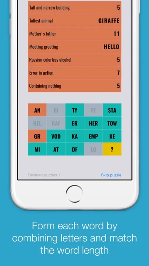Nothing breaks words better than this little game. Your task? Rebuild the words by combining the letter units it gives you.YOUR MISSIONUse the clues to form the words by chaining together letter units. It's easier and more fun than solving crosswords!BE SMART AND GET REWARDEDThere are more than 100 puzzles for you to solve, from surprisingly simple to really brain challenging. You earn coins each time you complete a puzzle.NEVER GET STUCKWhenever you feel less inspired, use the coins to get hints or move to the next puzzle.Not enough coins? The store is always open to buy coin packs.