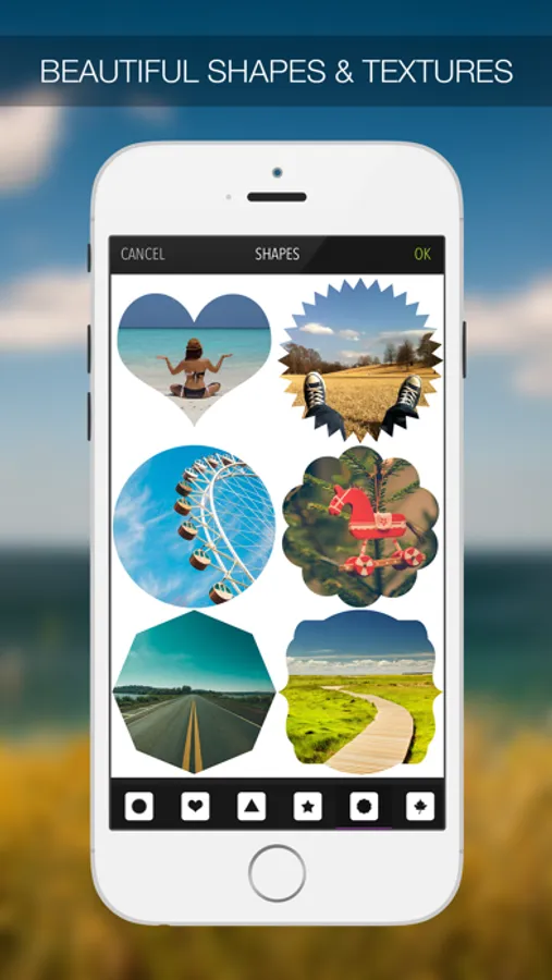 Add new colors to your photo by putting it in a shape or frame. You can choose the most suitable color or pattern for your photo.