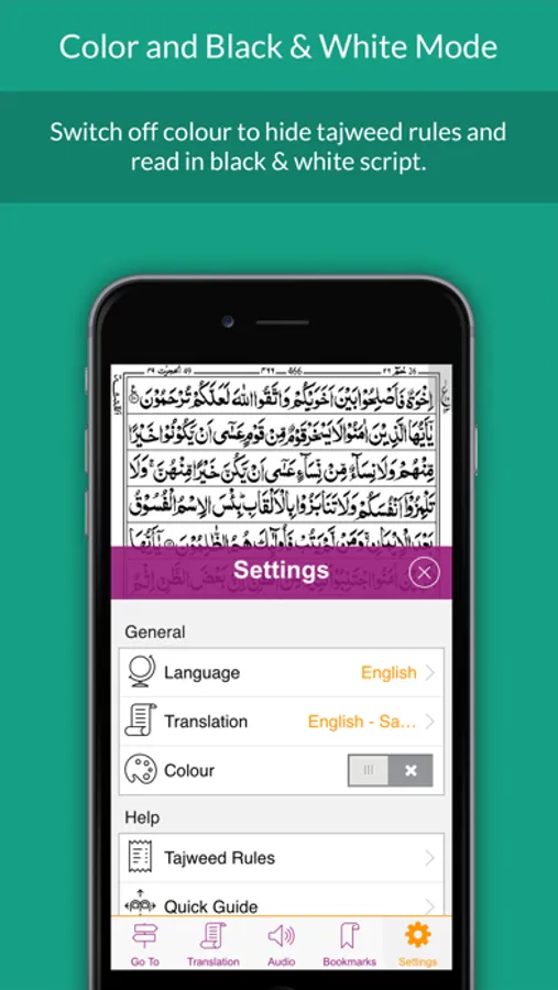 - Read in color with tajweed rules or read in black and white