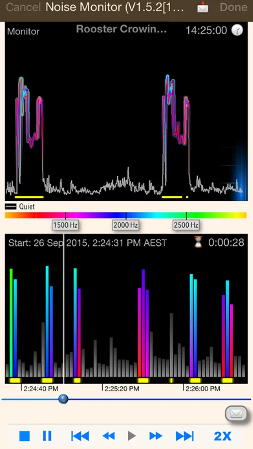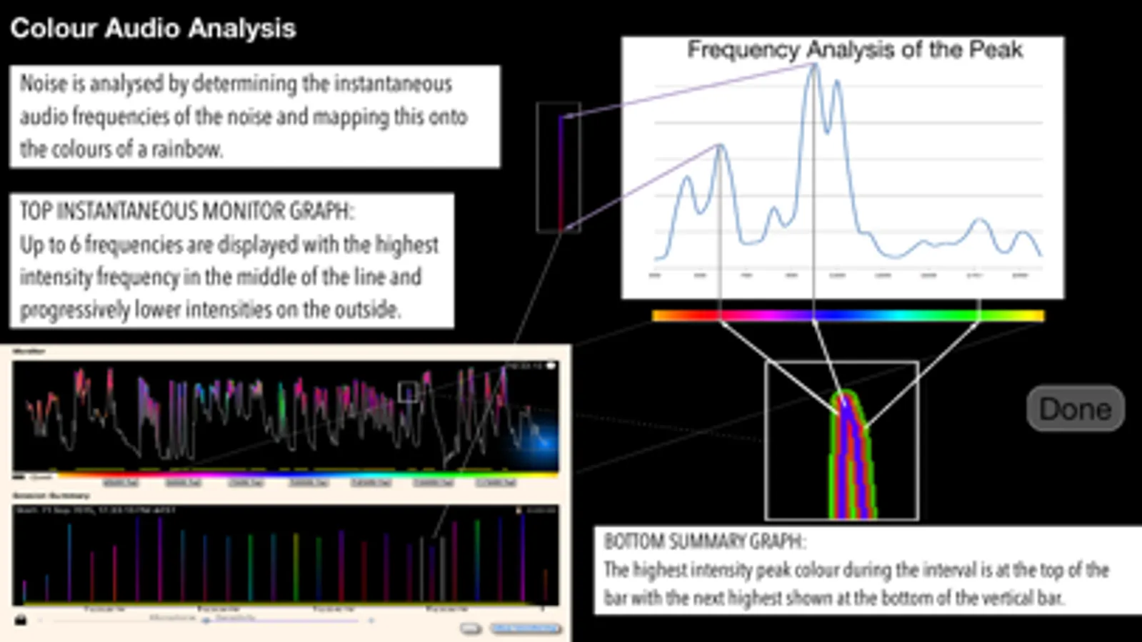Noise is analysed for you by determining the instantaneous audio frequencies of the noise and mapping it onto the colors of a rainbow. On the top instantaneous graph up to 6 frequencies are displayed with the highest intensity frequency in the middle of the line and progressively lower intensities on the outside.