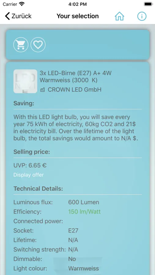 This is how it works: Just tap the lamp you want to replace and a few clicks away the app offers a whole list of efficient LED alternatives including prices. In addition, the App LED Navi calculates how much electricity costs can be saved compared to the lamp to be replaced. So the purchase of the app pays for itself quickly.
