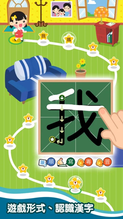 【寫字練習】 遊戲先有動畫示範寫字筆順, 然後小朋友可以自己進行寫字練習