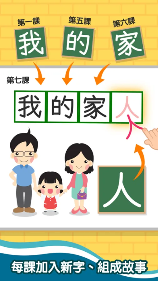 【故事形式】 遊戲會以故事形式進行, 每次加入一個新的字, 使小朋友可以透過動畫故事慢慢累積學習成果