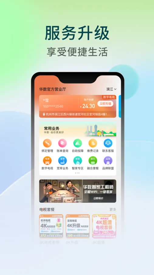 【服务升级 享受便捷生活】华数营业厅升级服务覆盖省网用户,随时随地在线查询办理业务。集成智家服务,全屋智联便捷操作。更有广电5G靓号办理、特惠套餐选择,上线城市便民服务,商城优品轻松购买,让您生活更省心。