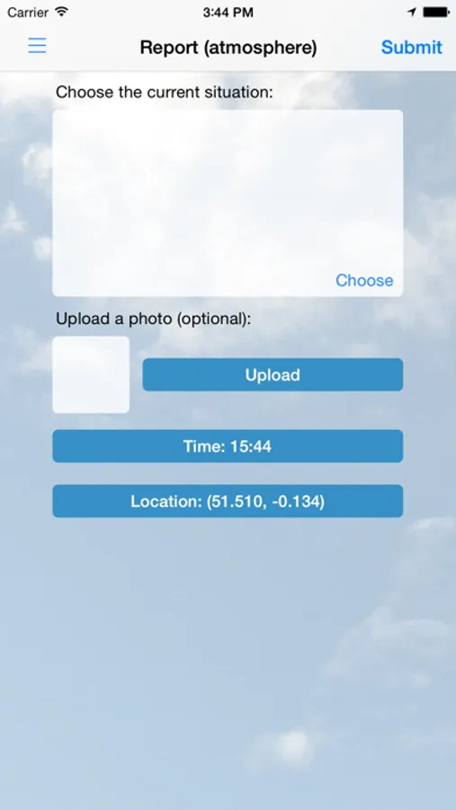 With this app we try to collect a lot of information about the weather. To do this, we will ask you to select a weather category (e.g. clear sky). We will use this information to analyse how people categorize the weather. All the information collected will only be used for research purposes.