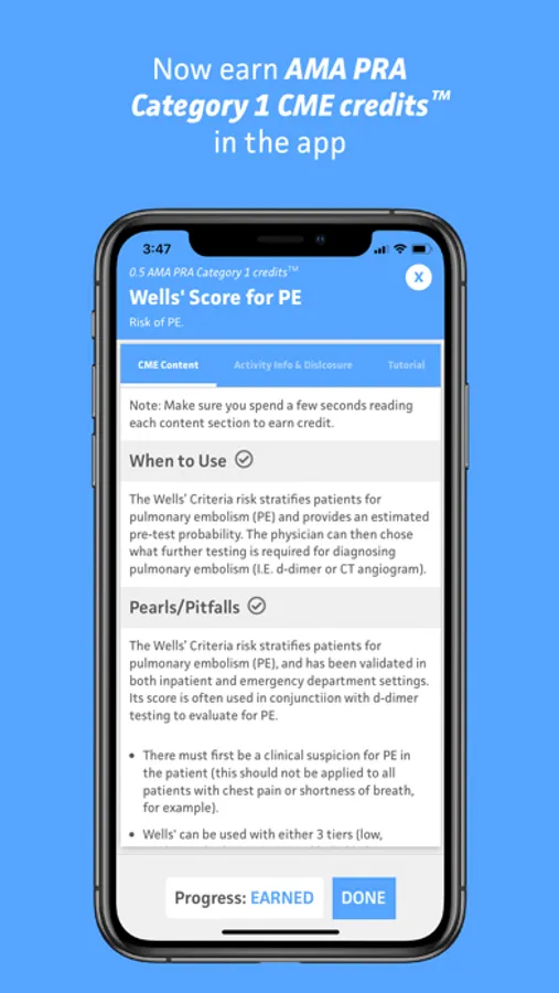 With a new enhancement, clinicians can now earn AMA PRA Category 1TM CME credits by simply reading the clinical content for 150+ calculators. The app will keep track of the CME credits earned in a personal dashboard, where users can also redeem credits for certificates and access their receipts for easy documentation. In order to redeem CME credits, users will need to sign up for a paid CME plan.