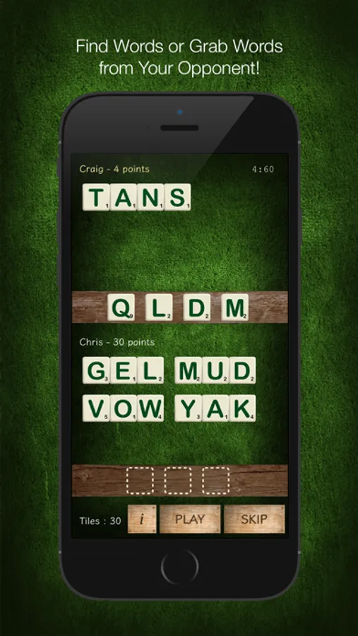 Find words, and grab words from your opponent - when the tiles run out the player with the highest letter score wins. The fastest to find a word gets it - but careful - longer words beat faster words! Should you be quick and grab the first word you find? Or should you take your time to find the longest word you can? The choice is yours...