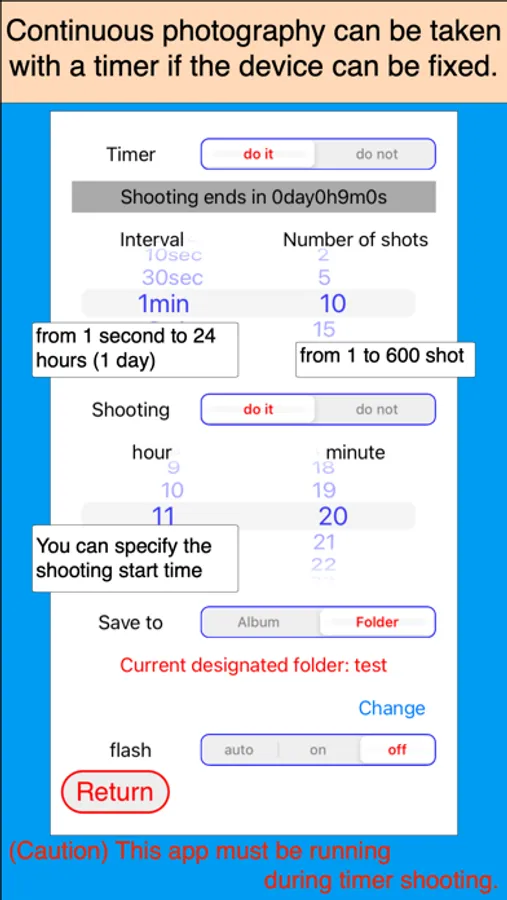 - Shooting interval 1 seconds, 5 seconds, 10 seconds, 30 seconds, 1 minute, 2 minutes, 5 minutes, 10 minutes, 20 minutes, 30 minutes, 1 hour, 2 hours, 6 hours, 12 hours 24hours