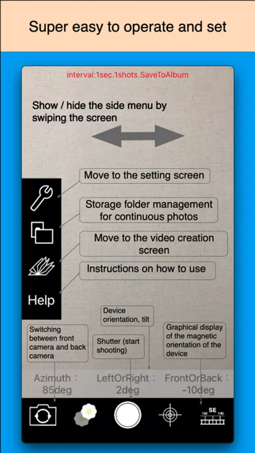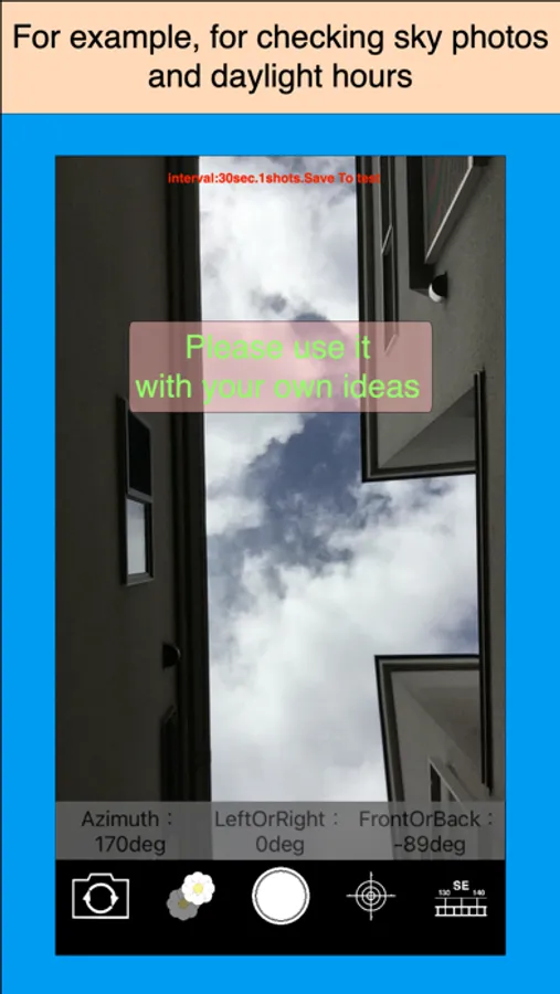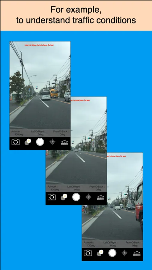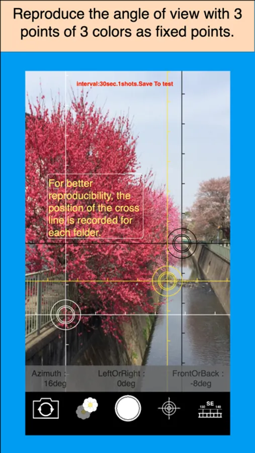 This app is a camera application, for a long time equidistant still image shooting, or if equidistant photography is not possible, is a camera application that has a function to easily reproduce the same angle of view.
