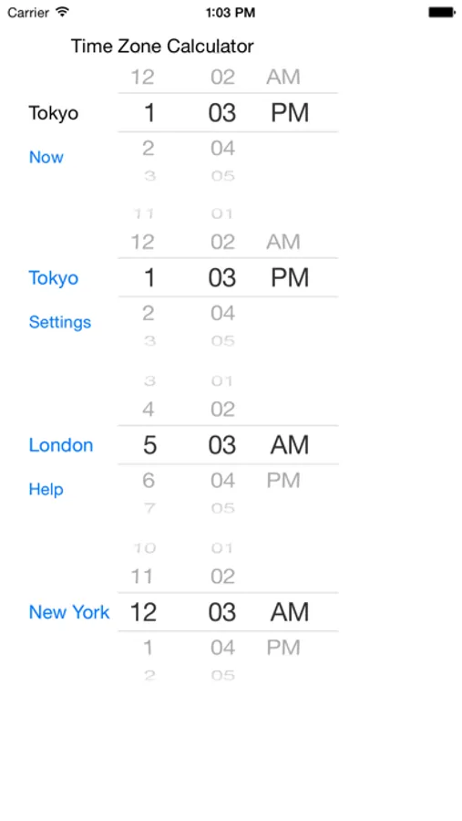 The top city is always set to the phone's local time zone. The user can select the other cities / time zones by pressing the name of the city and selecting a new city / zone in the search dialog. Alternatively the Settings button will take the use to the standard iPhone settings screen.