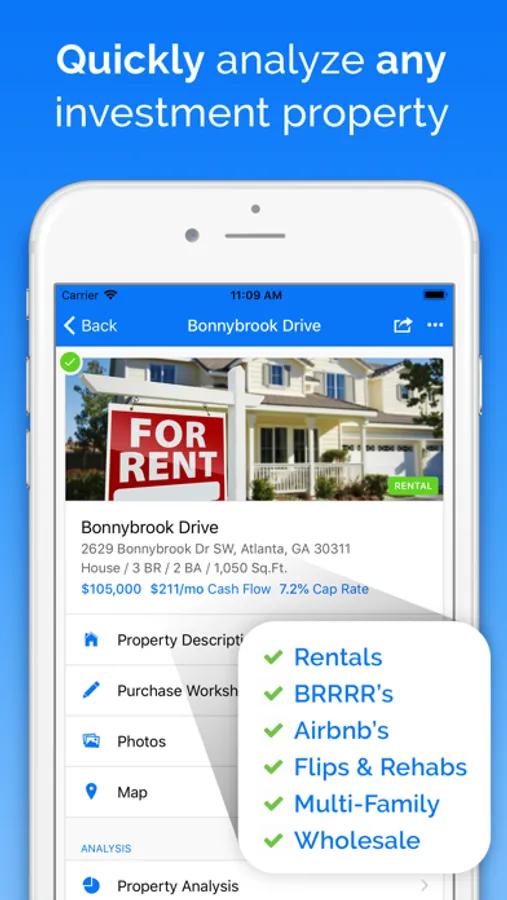 • Analyze single-family, multi-family and commercial rentals, BRRRR's (buy, rehab, rent, refinance, repeat), Airbnb's, house flips and wholesale deals