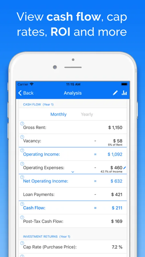 Quickly import property data from public records or enter it through a step-by-step wizard. Our app will calculate a complete analysis of the deal, including closing costs, mortgage payment, cash flow, ROI, profit and more.