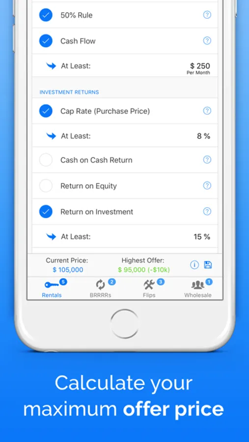 • Quickly vary your assumptions and view long term holding projections for rentals and profit projections for flips