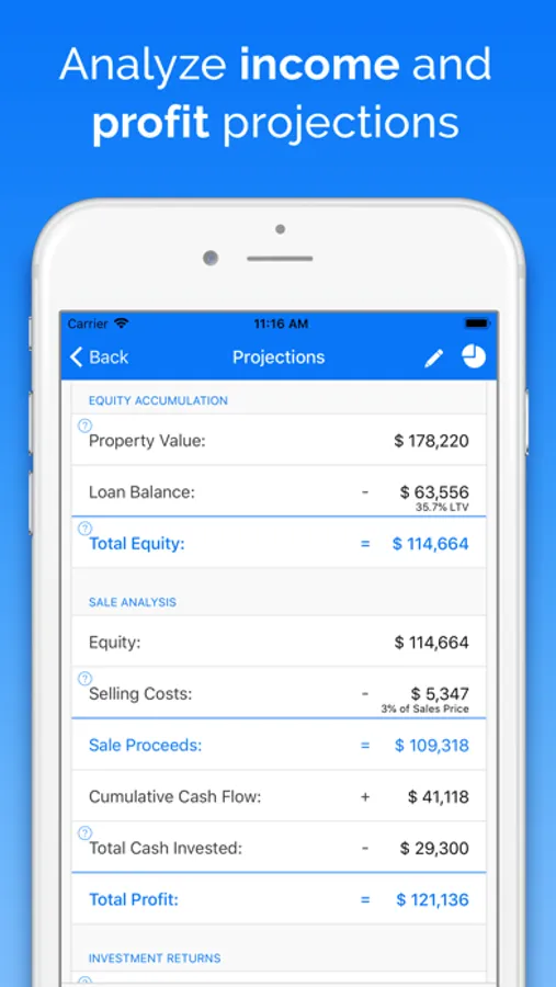 • View in-depth property analysis, including purchase breakdown, financing, cash flow, profit projections and investment returns