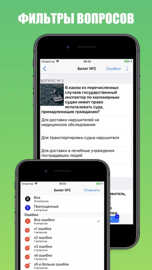 - Фильтры вопросов (правильно / неправильно / не отвеченные / пропущенные);