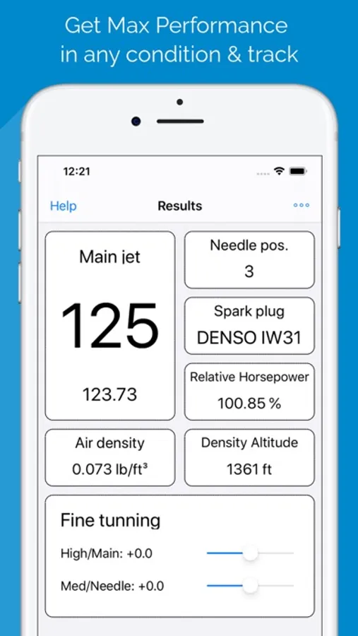 - Results: in this tab, the recommended main jet, needle position, air density and spark plug type values are shown. This data are calculated depending on the weather conditions and the engine configuration given in the next tabs. In addition, this tab lets to make a fine tuning adjustment to adapt to a concrete engine.