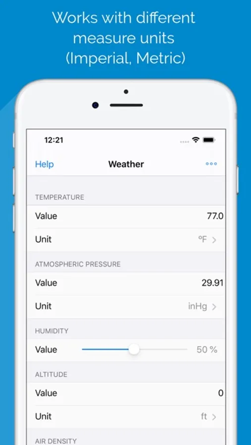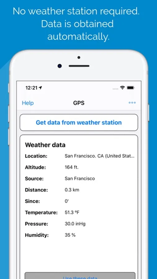 In order to get the weather values, the application can use the GPS to obtain the position and altitude, and the network connection to get the temperature, pressure and humidity from the nearest weather station. Nevertheless, the application can run without GPS and internet connection, in this case, the user has to give the weather data.