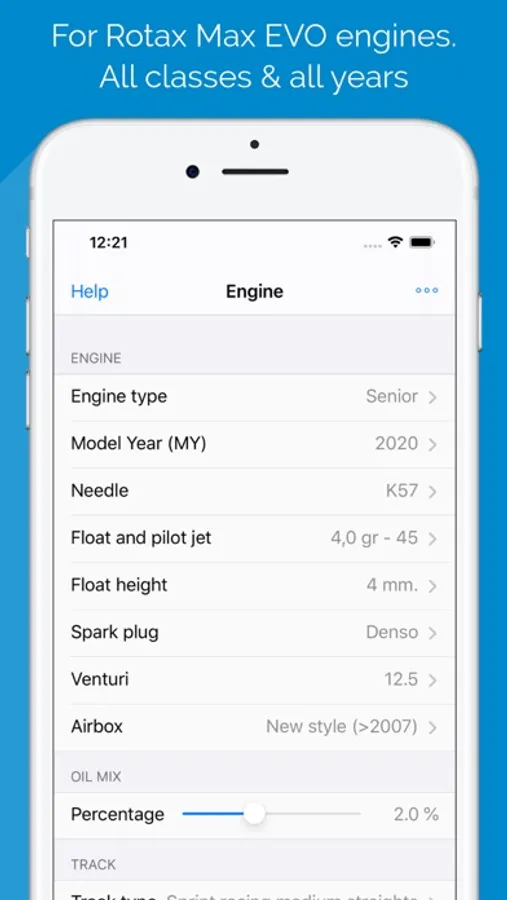 - Engine: you can set in this screen the information about your engine, carburator and track, that is, the engine type (Micromax, Minimax, Senior, Supermax, Junior or DD2), the model year of the engine, the spark plug brand used, the needle type, the float/pilot jet combo, the floats height, venturi, oil mix ratio, airbox type (new or old model) and the track type.