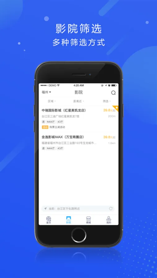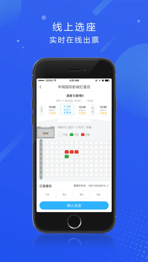 1.自助选座,快捷购票与影院前台售票系统同步,支持实时在线选座、快捷购票。