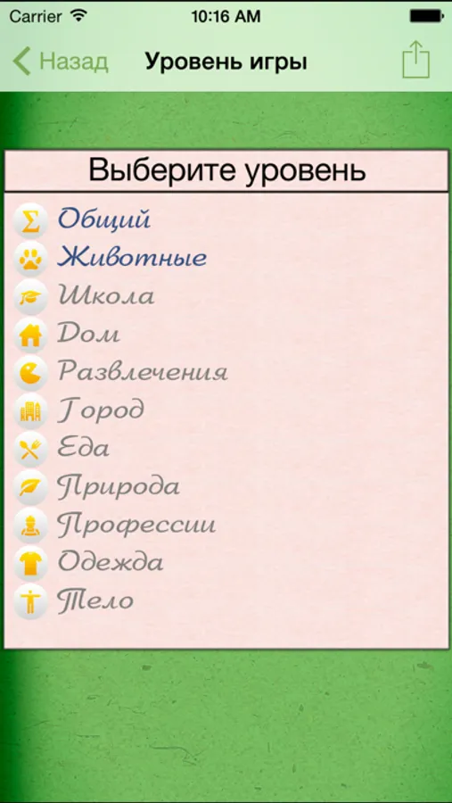 Один тур – 10 слов. В конце раунда пользователь получит оценку своих знаний от «1» до «5+».