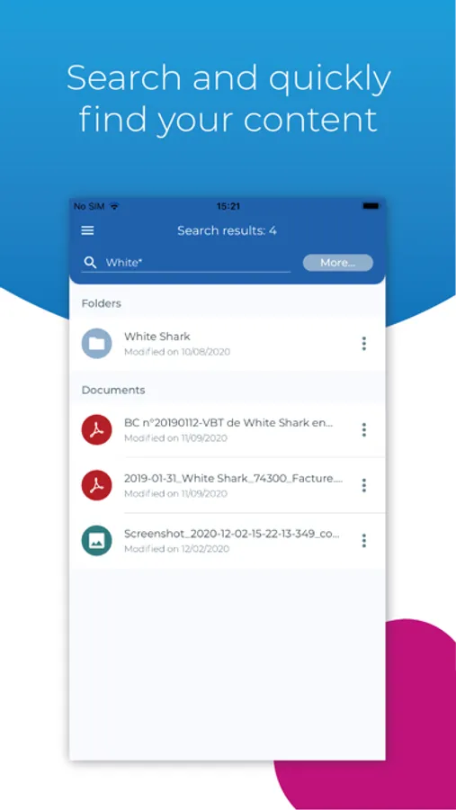 • Find your documents in a matter of seconds thanks to a powerful and intuitive search engine