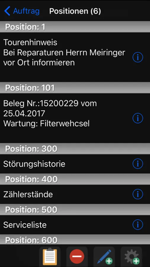 - Auftrag beim Kunden bearbeiten, Zählerstände erfassen, Positionen anlegen, Material zubuchen, etc…