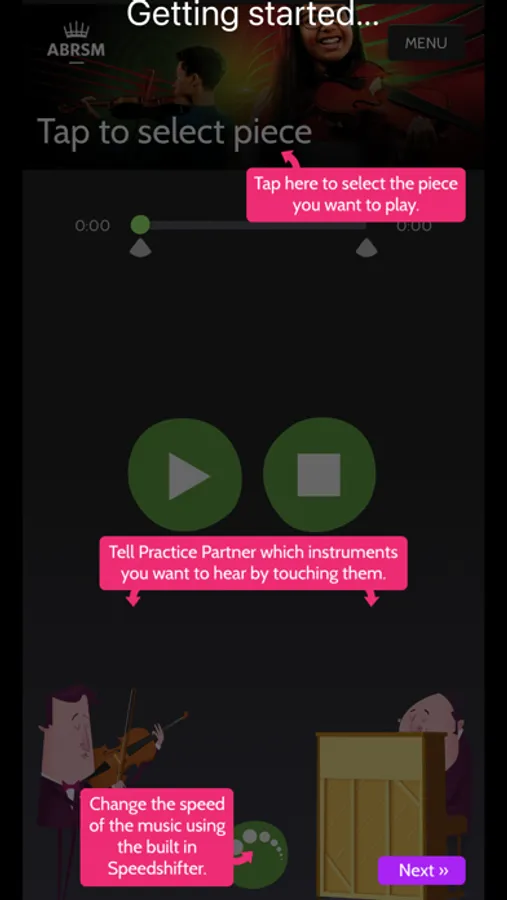 Use Violin Practice Partner to practise with the piano accompaniment, the violin part in isolation, or the duo ensemble recording. The app will help you to: