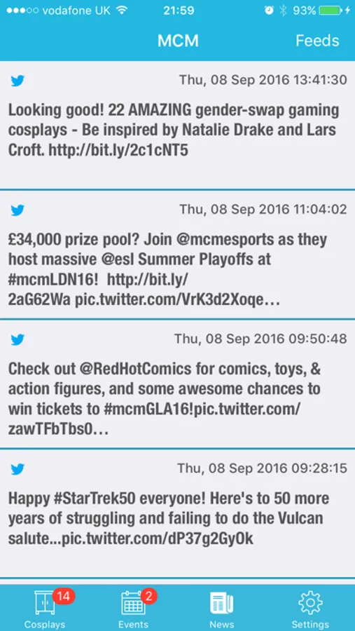 The fastest and simplist way to read all latest news and announcements from a conventions official RSS or Twitter feed.