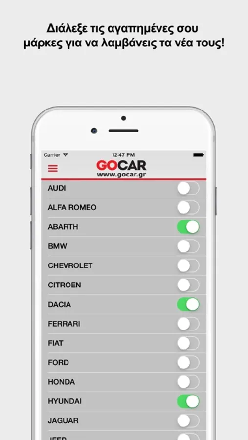 • Επέλεξε τις αγαπημένες σου μάρκες για να λαμβάνεις τις ειδοποιήσεις του GOCAR iPhone app με όλα τα νέα τους