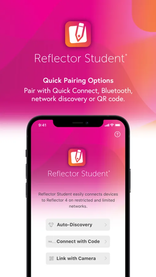 Some schools use separate networks for student and teacher devices, which can prevent screen mirroring between those devices. Reflector Student allows students to connect to Reflector 4 in almost any environment. Use auto-detection (Bluetooth and network), Quick Connect or QR codes to pair to Reflector 4. Once paired, the destination will appear in the iOS/iPadOS device’s AirPlay list.