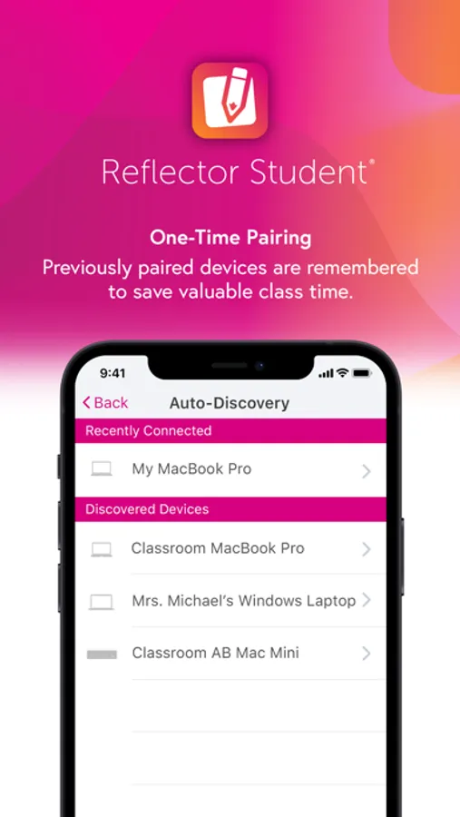 Once paired to a teacher computer, Reflector Student remembers the pairing to save valuable classroom time and prevent distractions in the future.