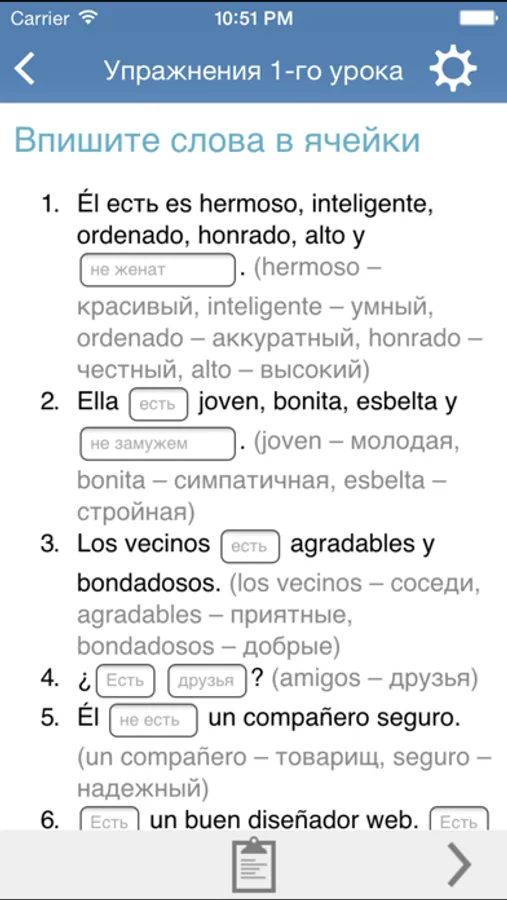 В наших упражнениях нужно самому сделать перевод всего предложения. Вы всегда можете свериться с ответами. 80% слов Вы найдете либо в теории урока, либо в предыдущих упражнениях, так что заглядывать в словарь на каждом слове совершенно необязательно. И запоминание слов происходит на практике, когда Вы самостоятельно строите фразы и предложения.