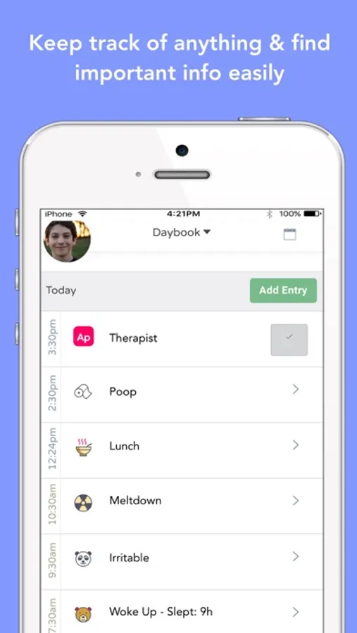 Easily keep track of meds, therapies, behaviors, sleeping habits, poop, meltdowns, eating & diets, or anything that you want to keep a record of, so you can figure out what's working and what needs to be changed, and have access to anything whenever you need it.