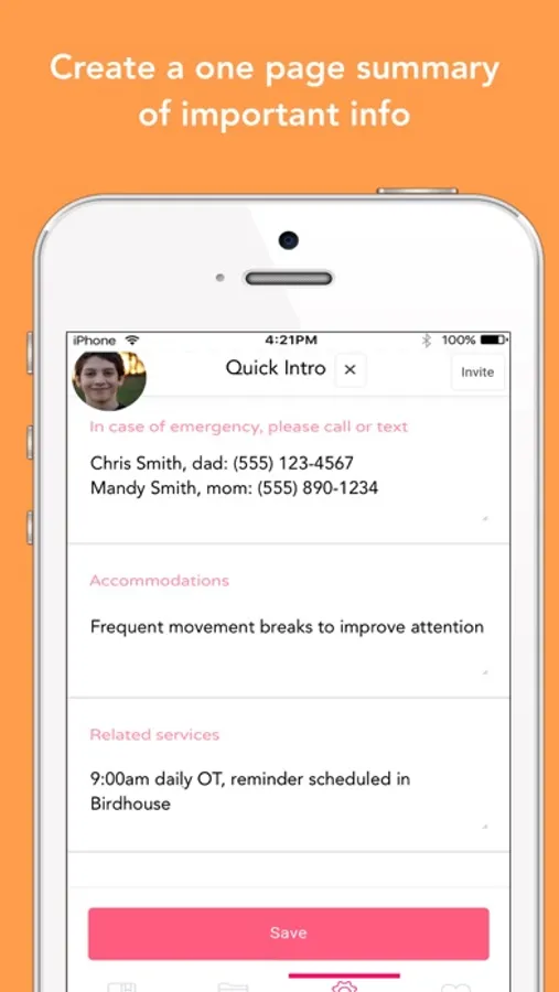Keep everything about ongoing care in one simple timeline. Organize behavior notes, nutrition, medical and doctor information, therapies, schedules, interventions, and more. Discover patterns and figure out how to improve care. Have this information at your fingertips anytime you need it, and share this information with anyone who needs to see it. Regain some control and sanity and watch how your care and outcomes improve and everyone's life becomes better.
