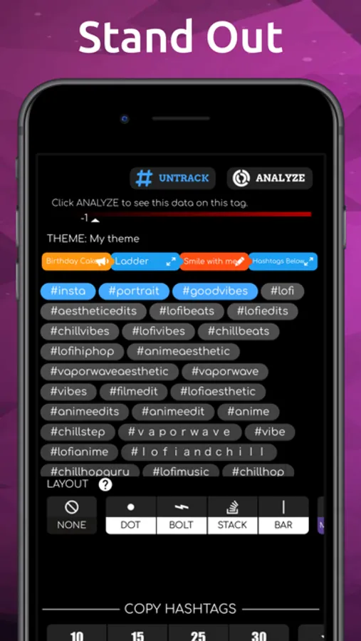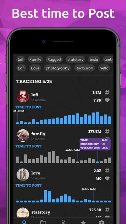 Simply enter a relevant hashtag or a word that describes the post, and we will return a custom-tailored list of hashtags based on the most popular posts that are similar to yours! Feel free to use obscure or specific terms, in ANY language. The app will show you the popularity of that tag and how many posts use it. Use a mix of popular and less popular tags to broaden your reach. You can tap and remove any tags you don't want.