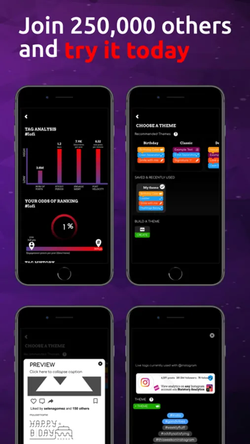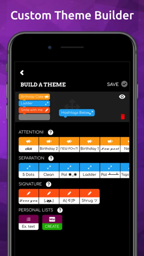 Use Themes and hashtag Layouts to take your Instagram game to the next level. Put together greetings, signature lines, and separators to make your post stand out! You can even add your custom tag lines, and lists. Go crazy and experiment.
