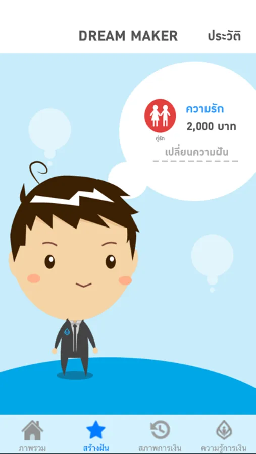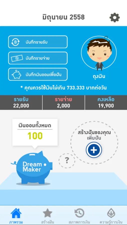 แอพลิเคชั่นที่จะช่วยสร้างฝันของคุณให้เป็นจริง ดูแลบัญชีรายรับ – รายจ่าย และออมเงินอย่างมีประสิทธิภาพ เพียงตั้งเป้าหมาย และกำหนดระยะเวลา หรือจำนวนเงินที่ต้องใช้ DreamMaker จะสรุปจำนวนเงินที่ต้องออมในแต่ละวัน สถานะความฝัน และระยะเวลาที่เหลือ ช่วยให้การบันทึกค่าใช้จ่ายและติดตามฝันเป็นเรื่องง่ายๆ มาเริ่มสร้างฝันไปกับเรากันเลย!!!