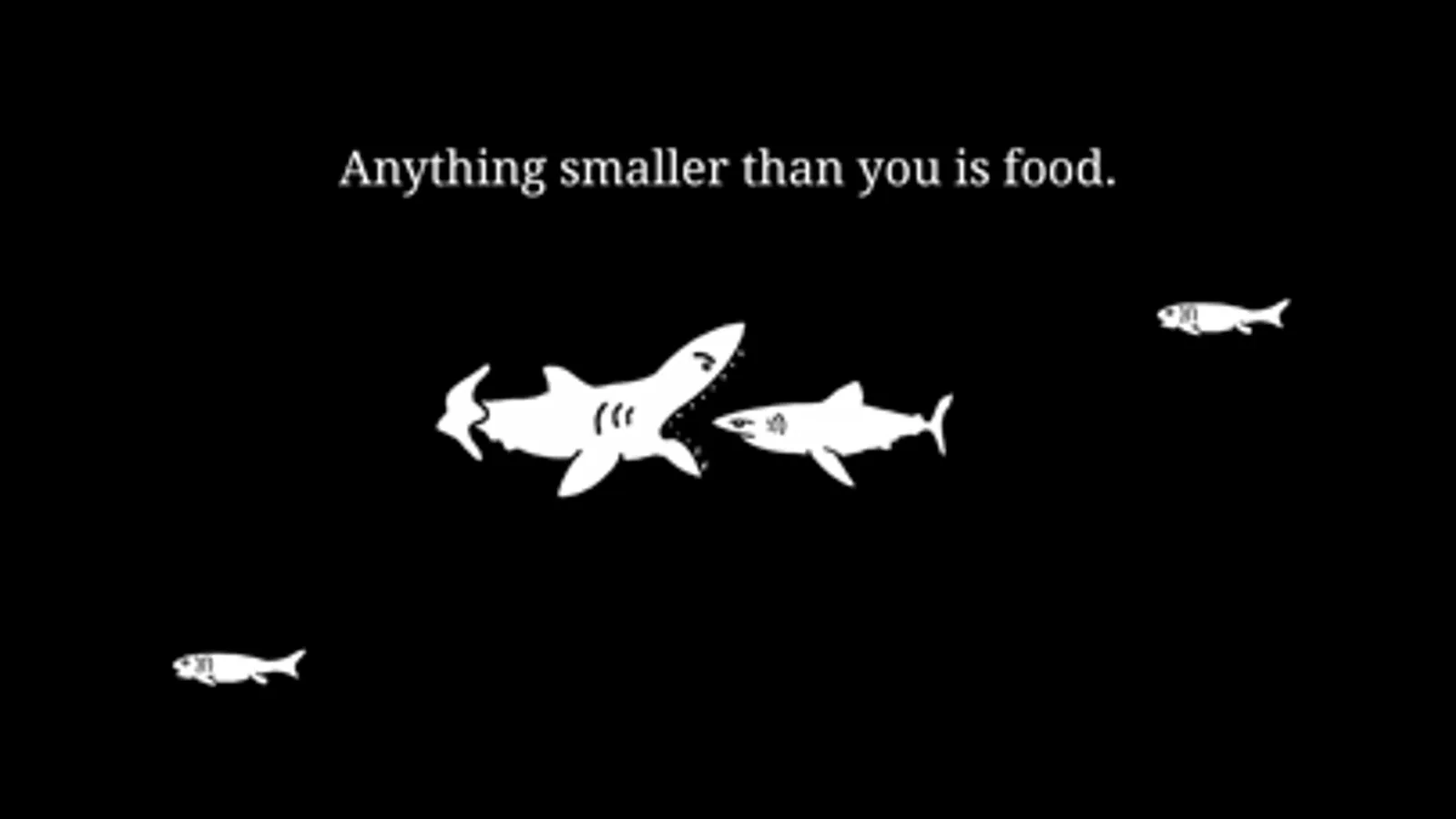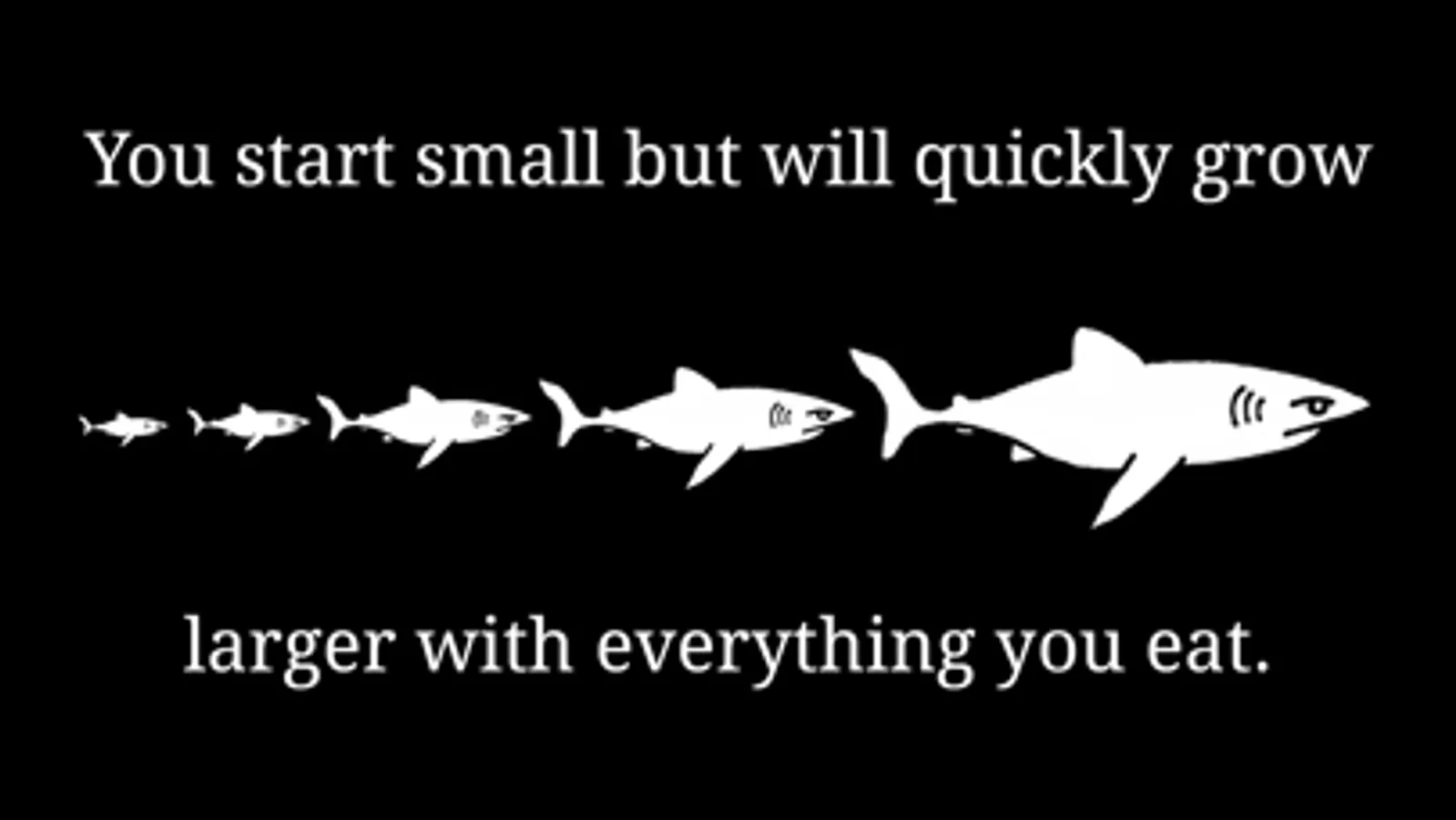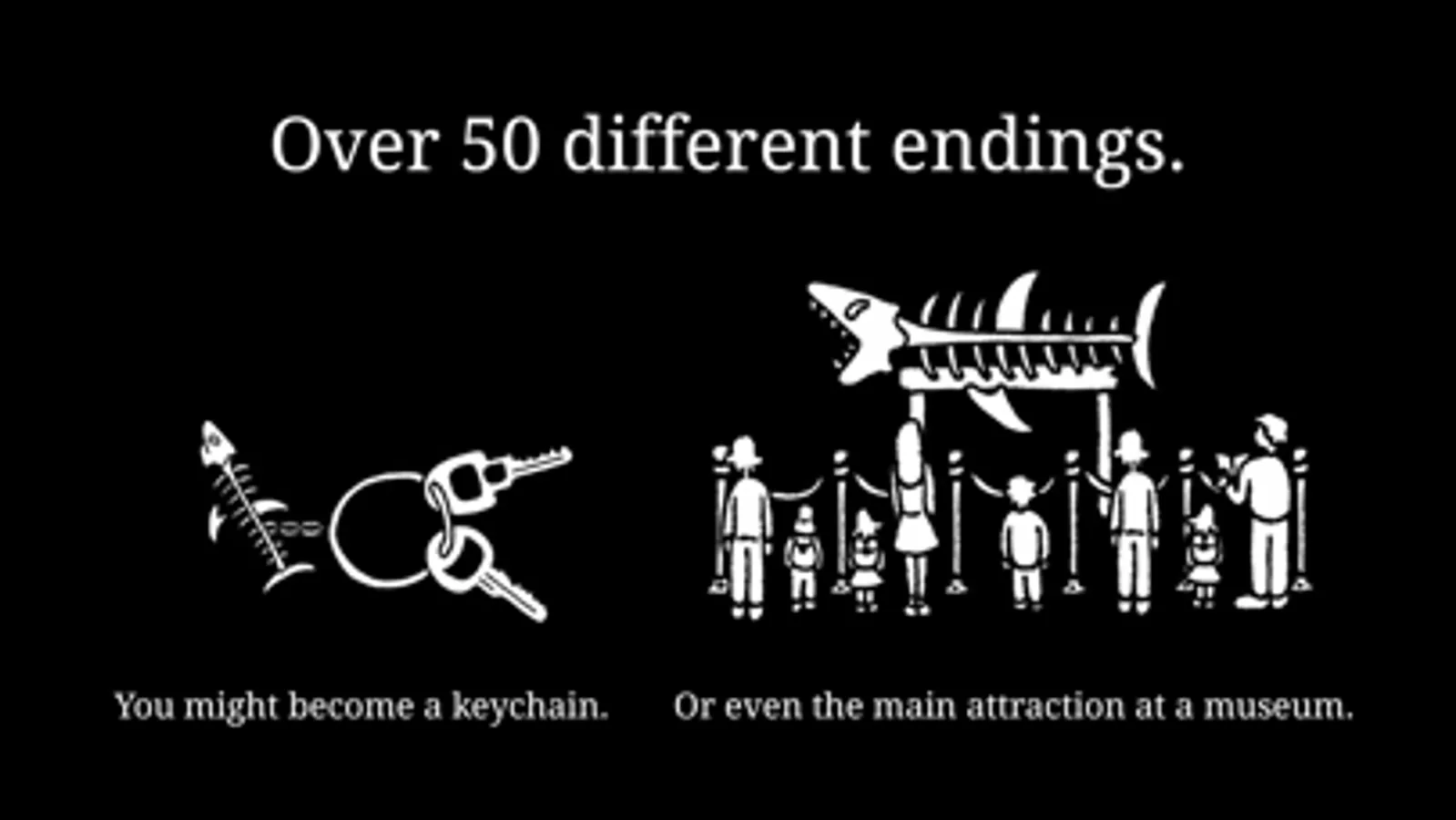Eat fish to grow in size. Avoid bigger sharks. You start small but will quickly grow larger and more able to consume others. Over 50 different endings depending on how large you grow. Your bones may end up as a keychain, earring, even become the main attraction at a museum.