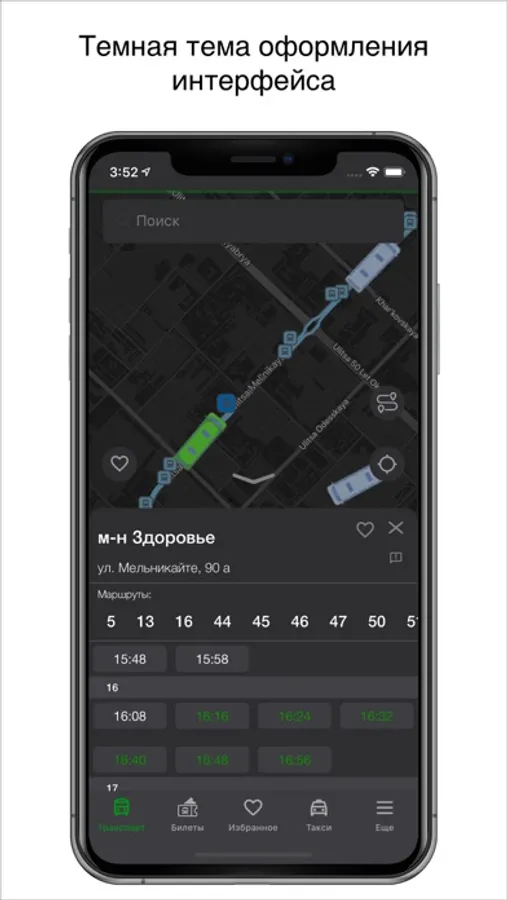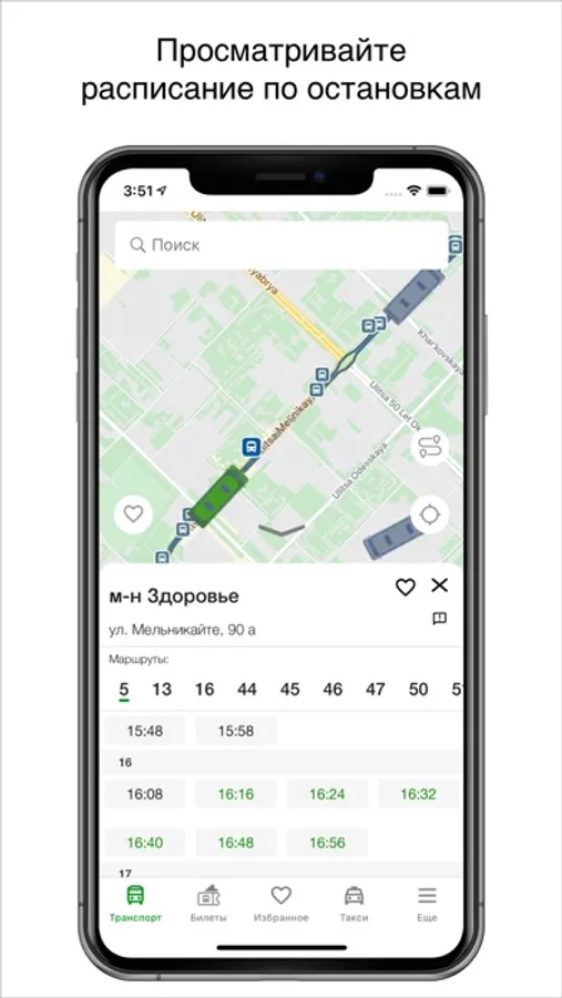 * Просмотреть остановочные пункты на карте и проходящие маршруты