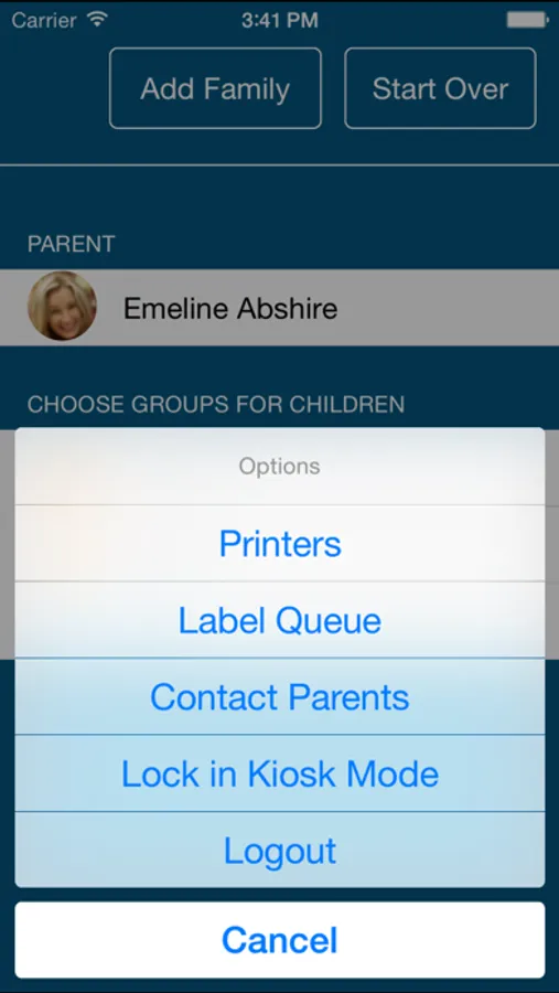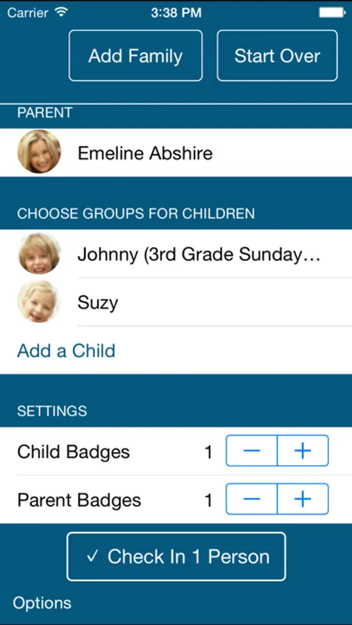 You can choose the group to check each child into, add new children and families, and edit the notes that print on the badges.