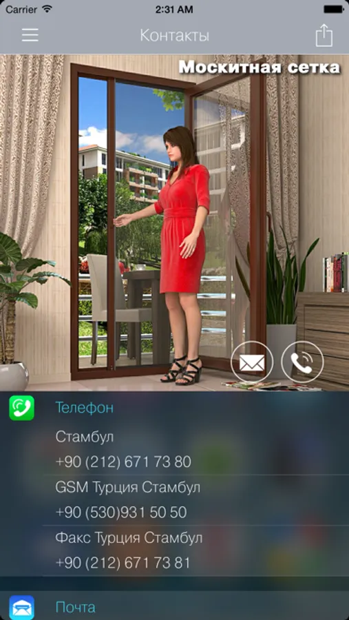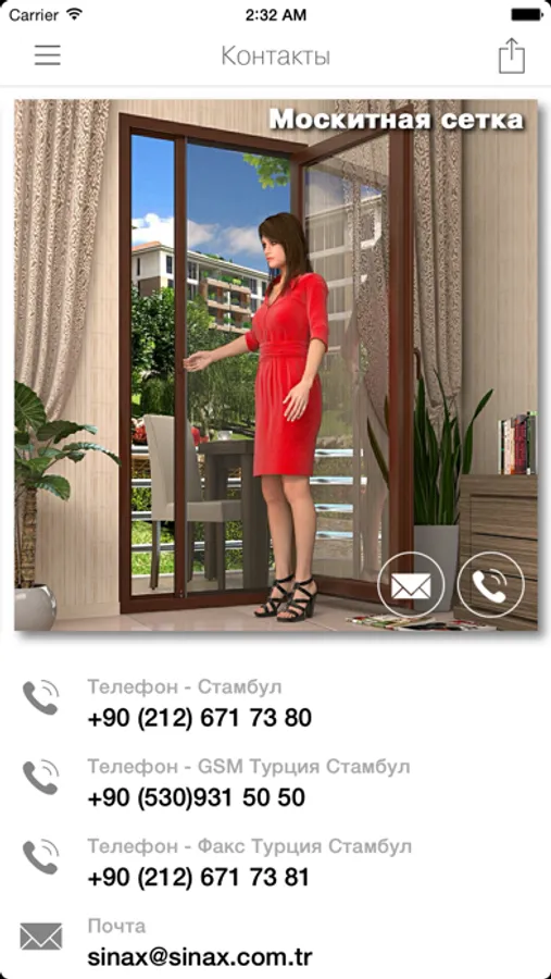 Все контакты на главной странице, прямо из приложения можно позвонить или отправить почту, перейти на сайт производителя или в социальную группу.