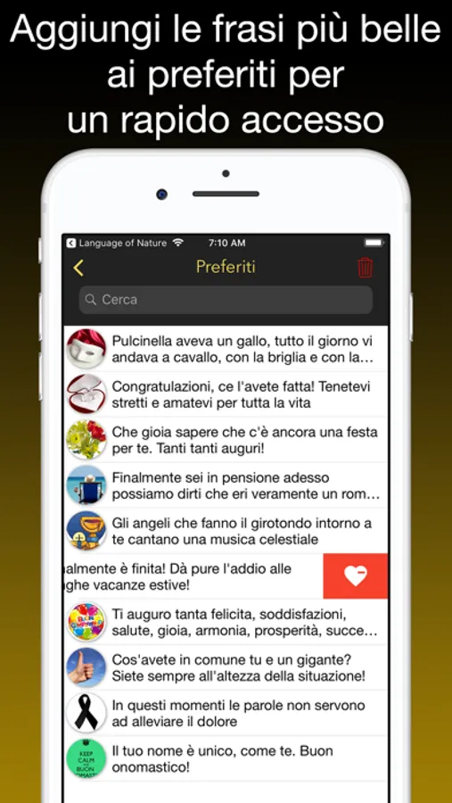 È possibile aggiungere la frase ai preferiti premendo il bottone a forma di cuore con un +